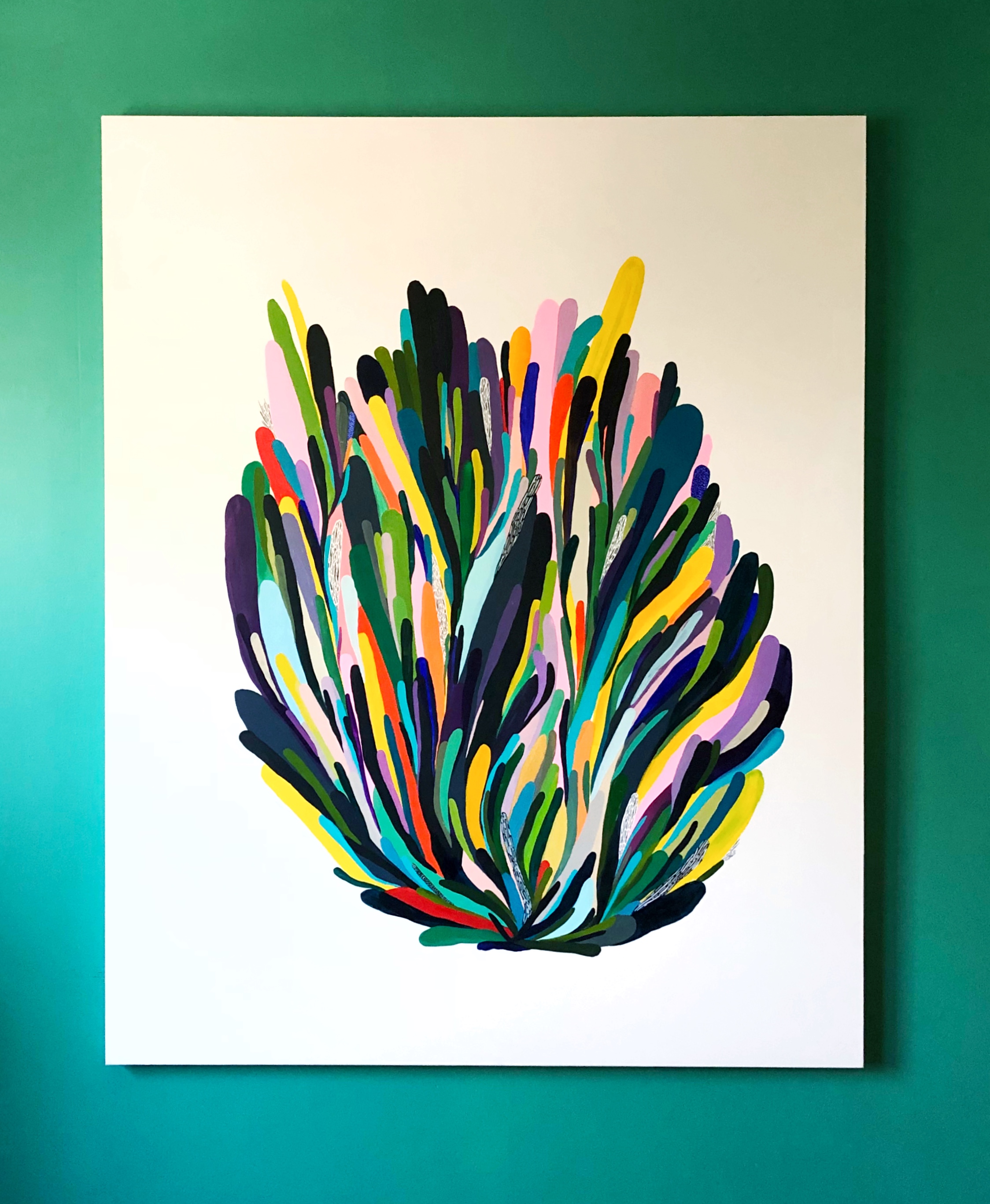 It measures 48"x60". Painted with acrylic and finished with a glossy varnish.